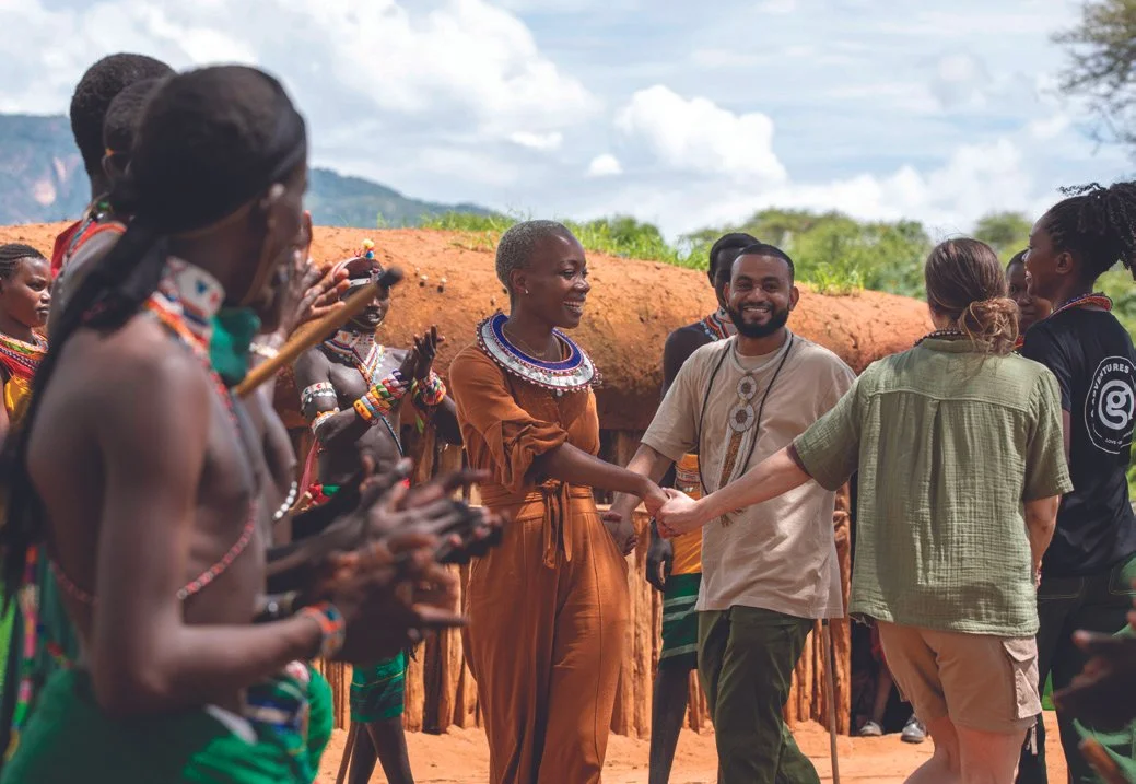G Adventures’ Geluxe guests dancing with locals in a Maasai village in Kenya, supporting community tourism.
